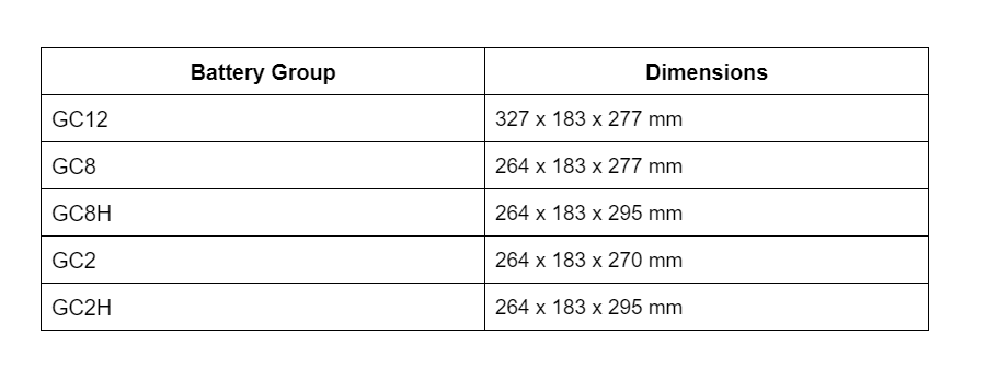 - 8 Volt batteries have two options: BCI Group GC8 or GC8H